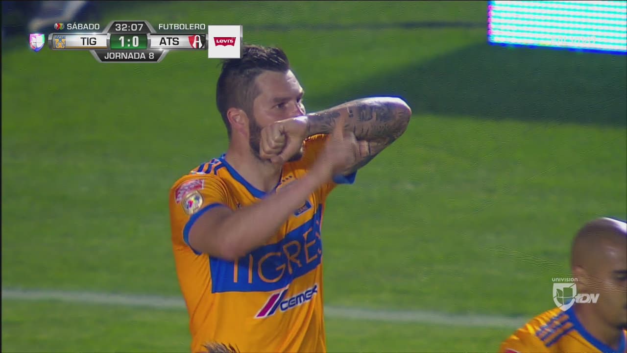 El delantero de Tigres le ganó la espalda a Rafa Márquez para sacar un remate cruzado tras un centro de Valencia.