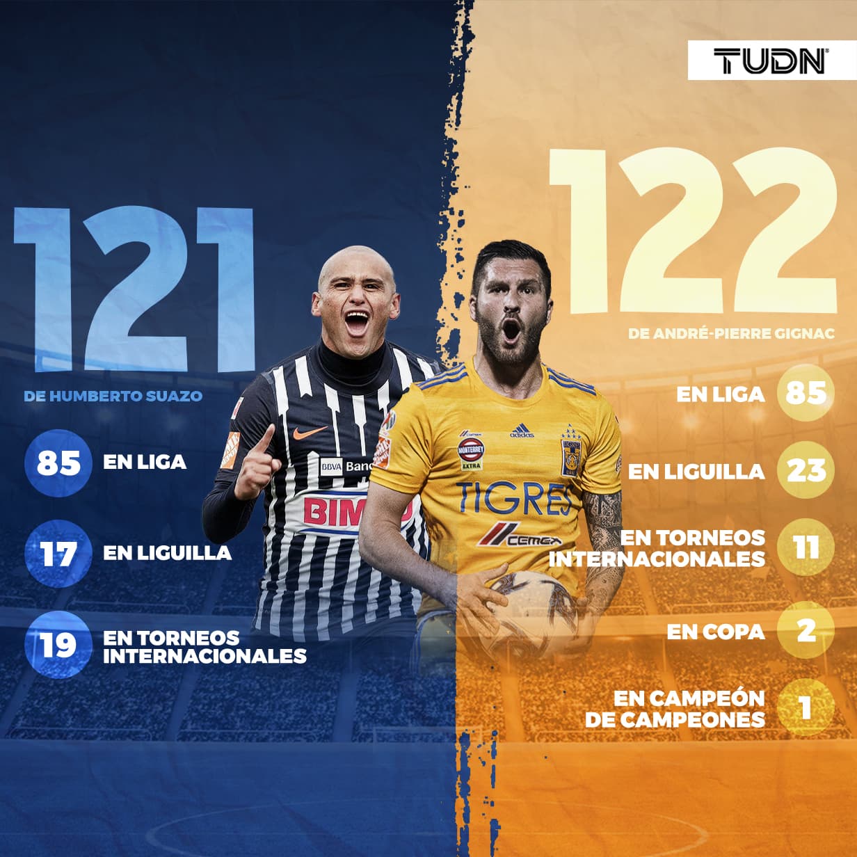 Gignac acumula 122 goles en partidos oficiales con Tigres, uno más que el chileno Humberto Suazo, quien marcó 121 con Rayados.