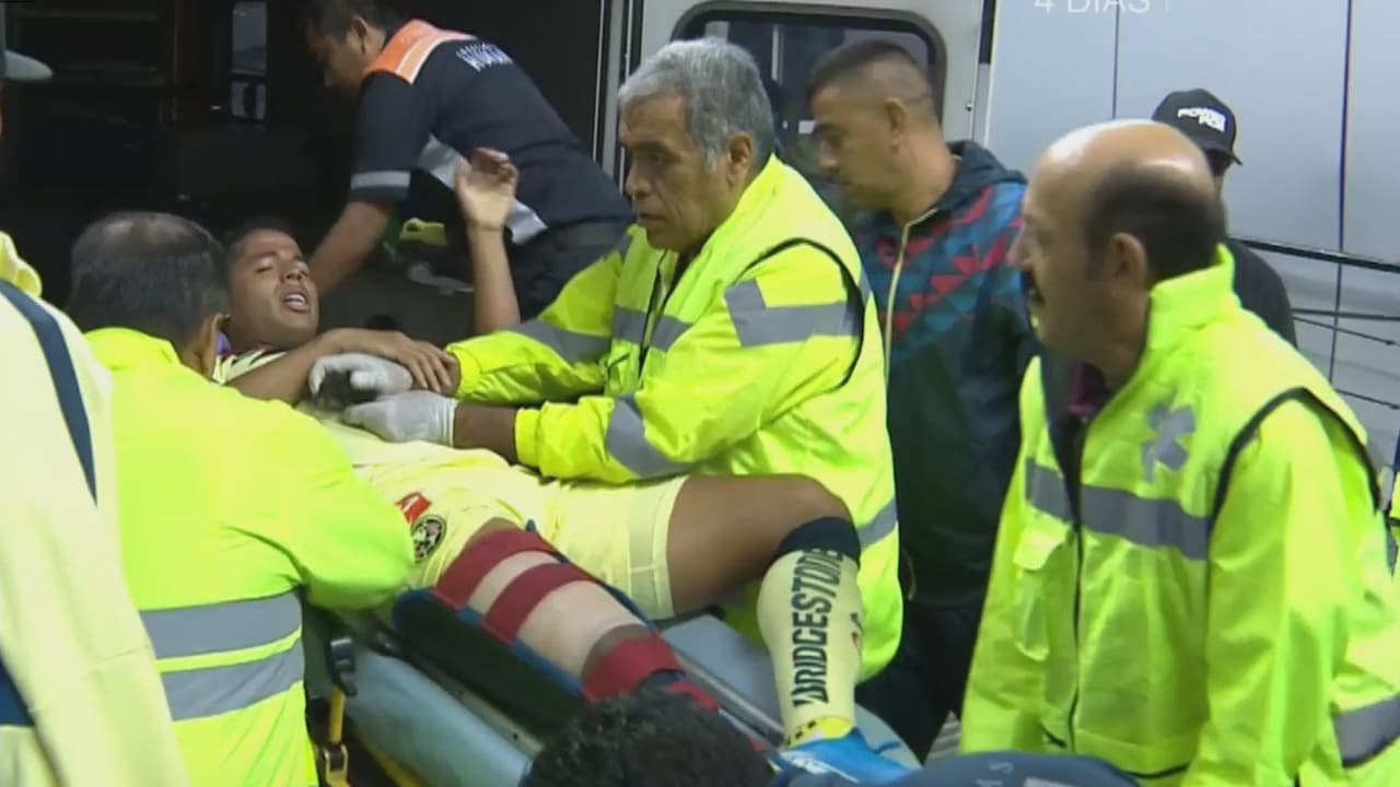 El jugador del América es trasladado a un centro asistencial tras sufrir un fuerte golpe en su pierna derecha.