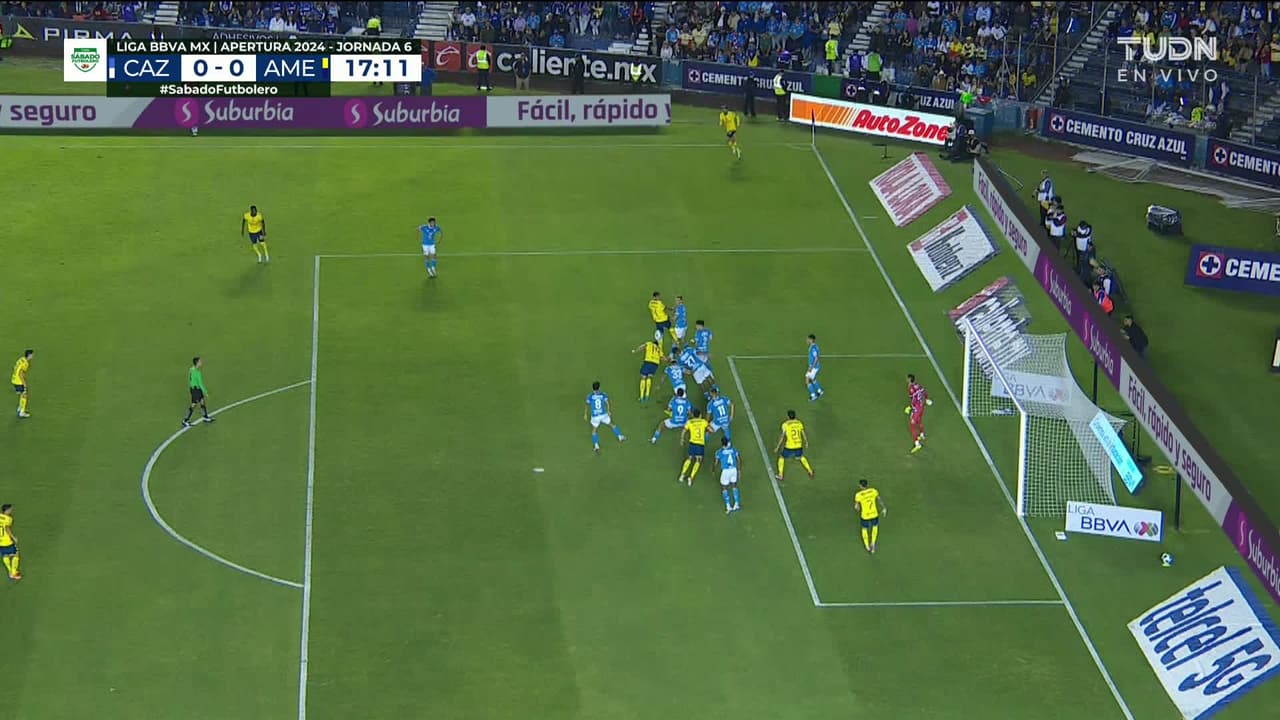 ¡Gol! Cruz Azul 0| América 1. Brian Rodríguez (América) disparo de cabeza a quemarropa desde el lado derecho tras un saque de esquina.