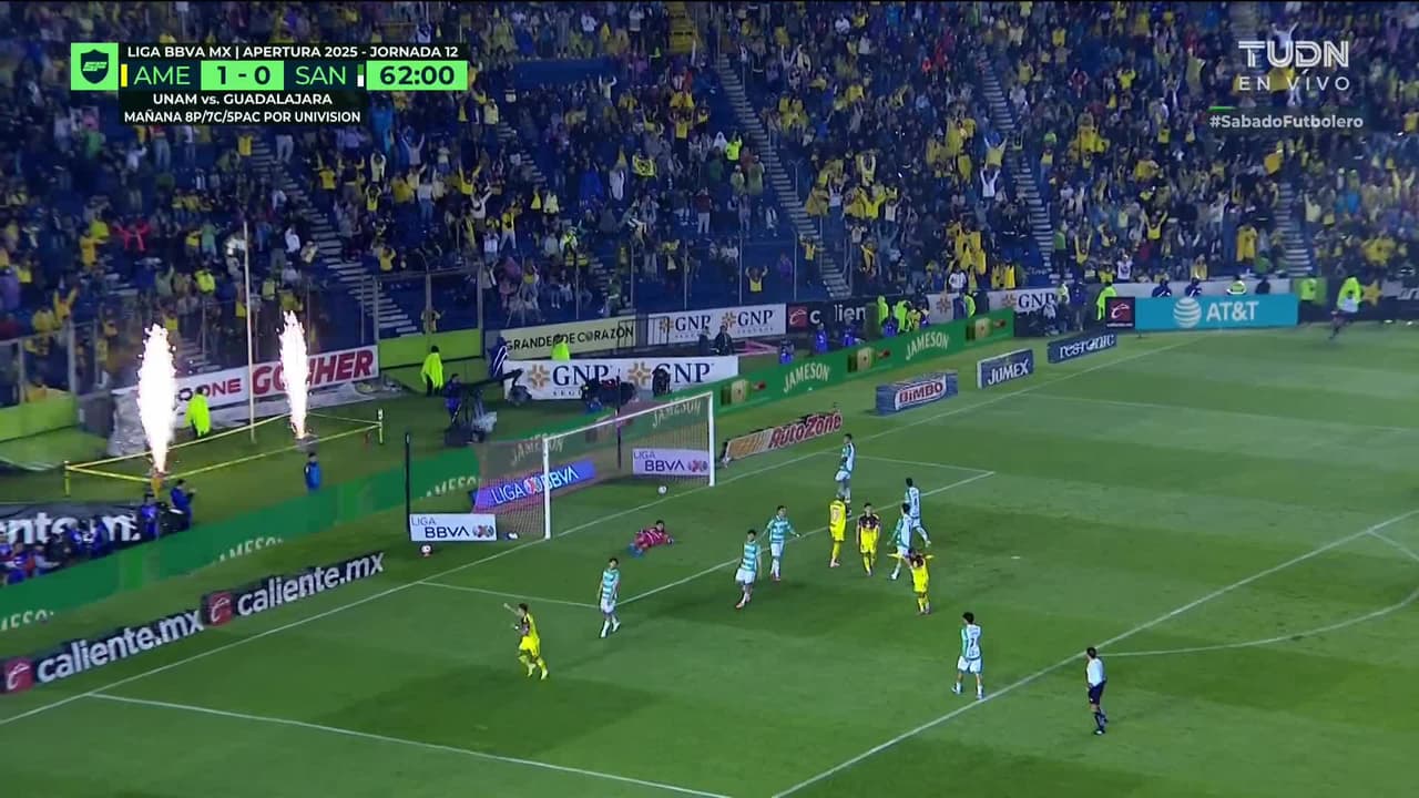 ¡Gol! América 2| Santos Laguna 0. Brian Rodríguez (América) Disparo con la derecha desde el lado izquierdo dentro del área.