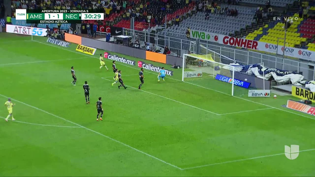 ¡Gol! América 2| Necaxa 1. Brian Rodríguez (América) zurdazo desde el lado izquierdo dentro del área.