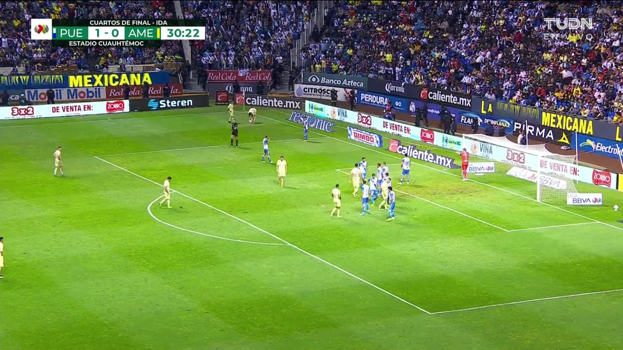 ¡Gol! Puebla 1| América 1. Diego Valdés (América) disparo de cabeza a quemarropa desde el lado derecho tras el cobro de una falta.