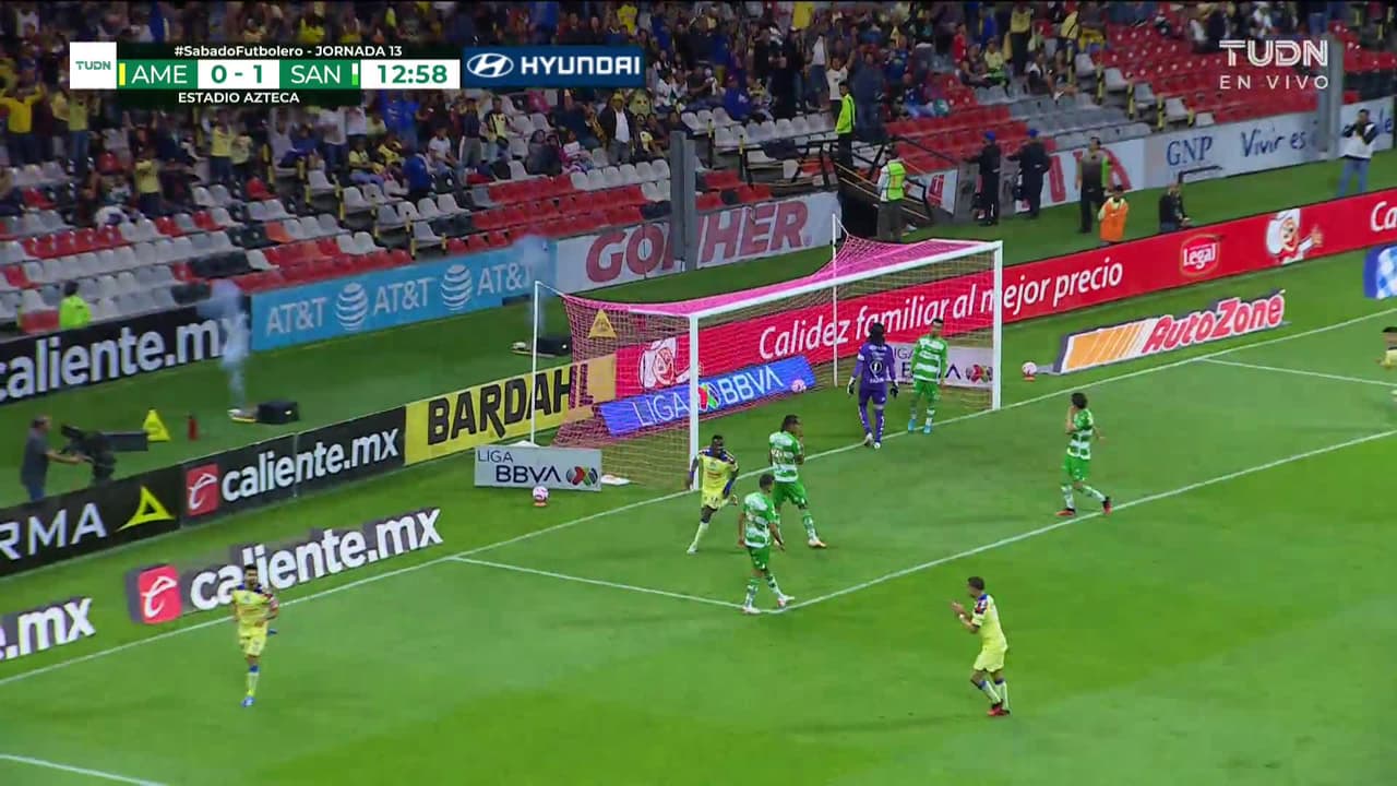 ¡Gol! América 1| Santos Laguna 1. Henry Martín (América) disparo de cabeza desde muy cerca por el lado derecho de la portería. Asistencia de Kevin Álvarez con un centro al área.