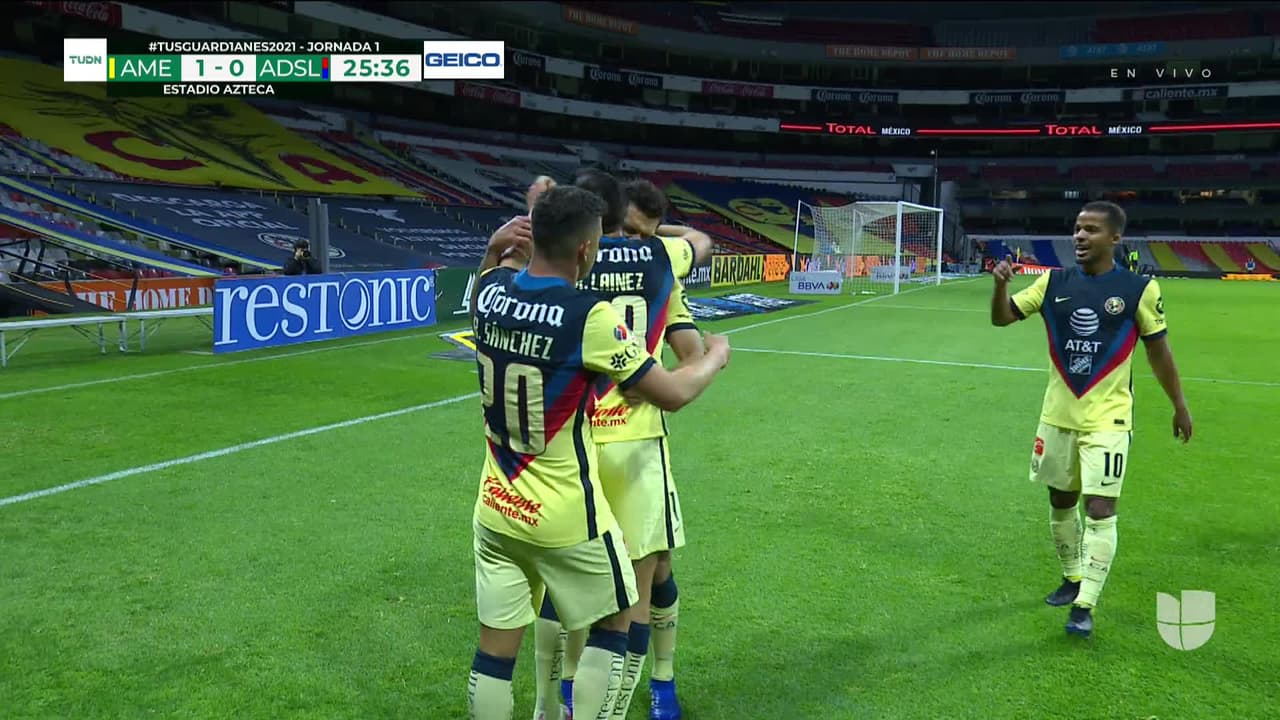 ¡Gol! América 1| Atlético San Luis 0. Mauro Laínez (América) zurdazo desde el centro del área disparo rastrero| junto al palo izquierdo.