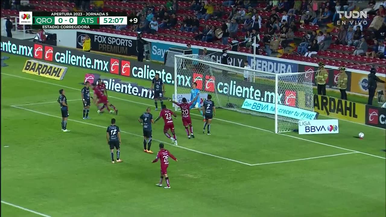 ¡Gol! Querétaro 0| Atlas 1. Augusto Solari (Atlas) disparo de cabeza desde el centro del área por arriba. Asistencia de Luis Reyes con un centro al área tras un saque de esquina.