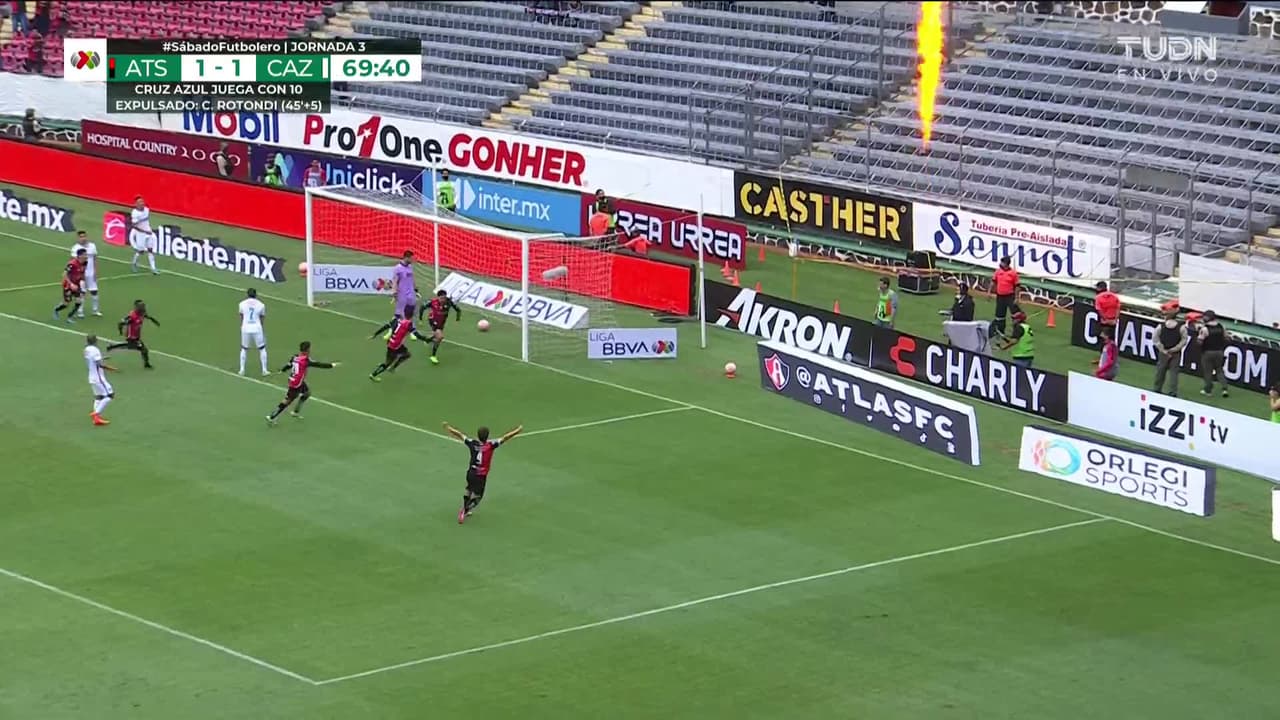 ¡Gol! Atlas 2| Cruz Azul 1. Jeremy Márquez (Atlas) disparo de cabeza desde el centro del área por el lado derecho de la portería. Asistencia de Edison Flores con un centro al área.