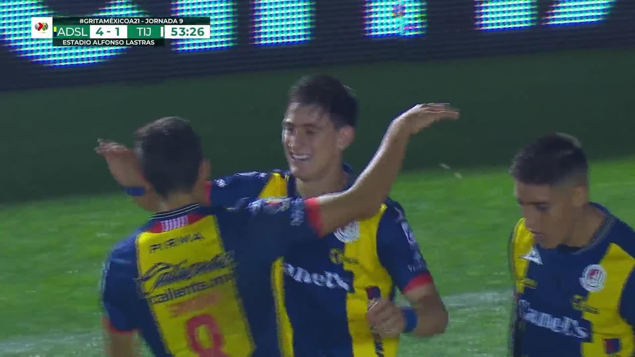 ¡Gol! Atlético San Luis 4| Club Tijuana 1. Facundo Waller (Atlético San Luis) Disparo con la derecha desde el centro del área al centro de la portería.