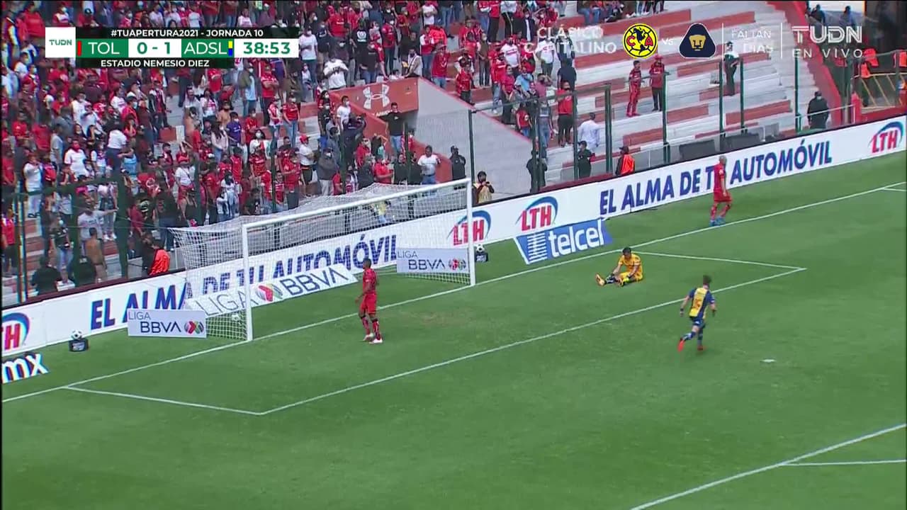 ¡Gooooool! Toluca 0| Atlético San Luis 2. Germán Berterame (Atlético San Luis) remate con la derecha desde el centro del área tras un contraataque.