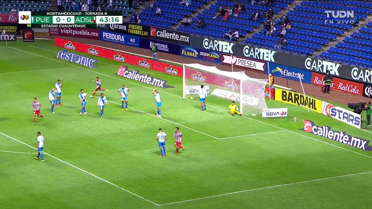 ¡Gol! Puebla 0| Atlético San Luis 1. Jesús Piñuelas (Atlético San Luis) Disparo con la derecha desde muy cerca tras un saque de esquina.
