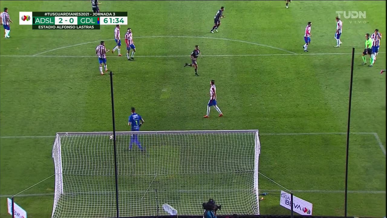 ¡Gol! Atlético San Luis 3| Chivas 0. Nicolás Ibáñez (Atlético San Luis) convirtió el penalti Disparo con la derecha al ángulo superior izquierdo.