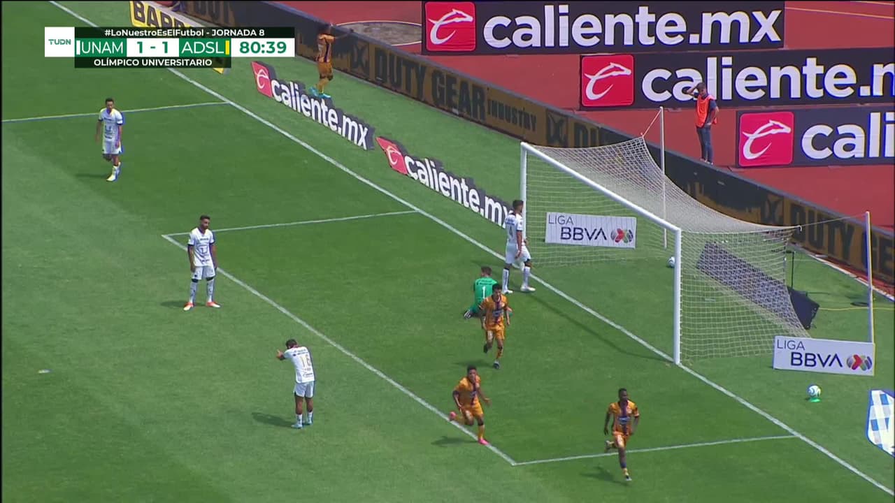 ¡Gol! Pumas UNAM 1| Atlético San Luis 2. Vitinho (Atlético San Luis) disparo de cabeza desde el centro del área.