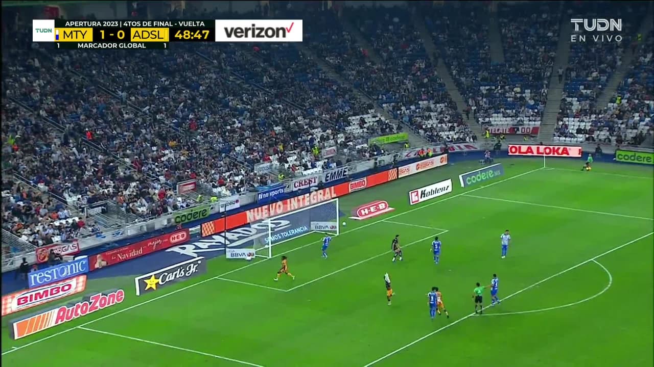 ¡Gol! Monterrey 1| Atlético San Luis 1. Vitinho (Atlético San Luis) zurdazo desde el centro del área disparo rastrero| junto al palo izquierdo tras un contragolpe.