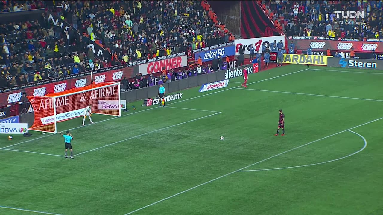 ¡Gol! Club Tijuana 2(2)| América 2(2). Alejandro Gómez (Club Tijuana) convirtió el penalti Disparo con la derecha.