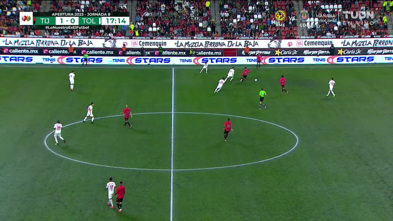 ¡Gol! Club Tijuana 2| Toluca 0. Fernando Madrigal (Club Tijuana) Disparo con la derecha desde el lado derecho dentro del área por el lado derecho de la portería.