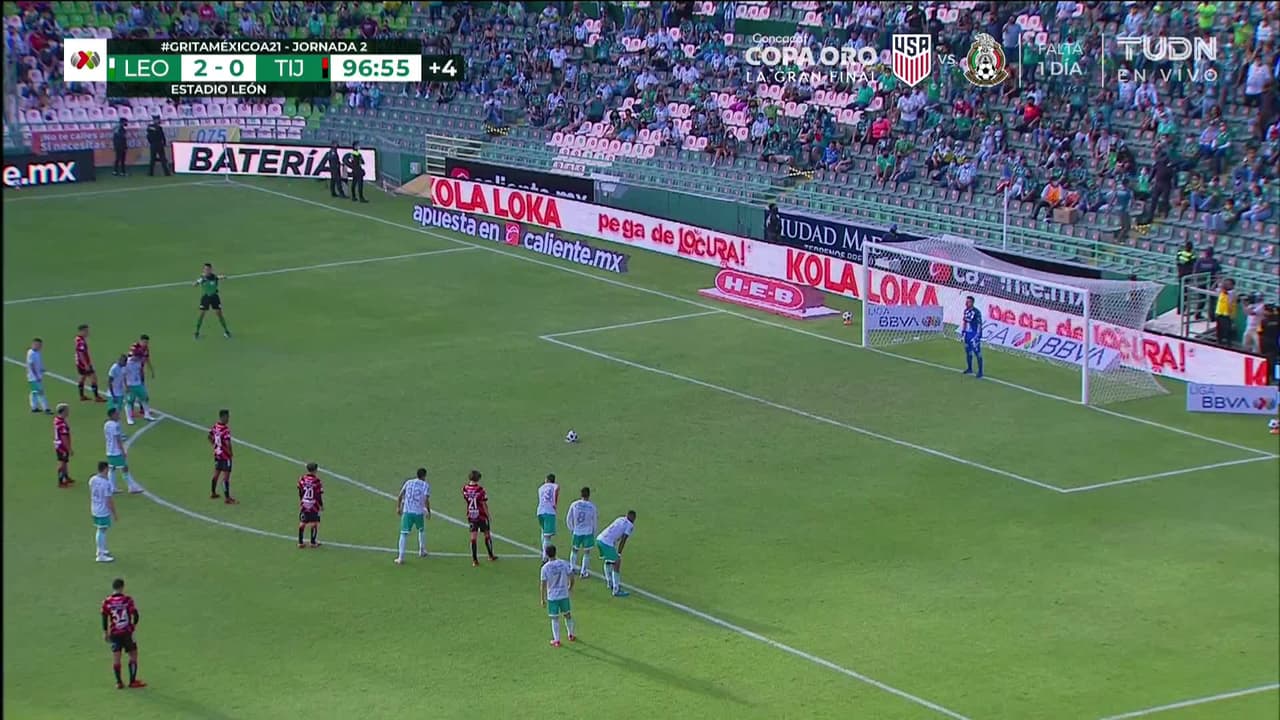 ¡Gol! León 2| Club Tijuana 1. Fidel Martínez (Club Tijuana) convirtió el penalti zurdazo.