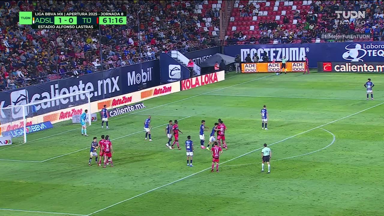¡Gol! Atlético San Luis 1| Club Tijuana 1. Jackson Porozo (Club Tijuana) disparo de cabeza desde el centro del área tras un saque de esquina.