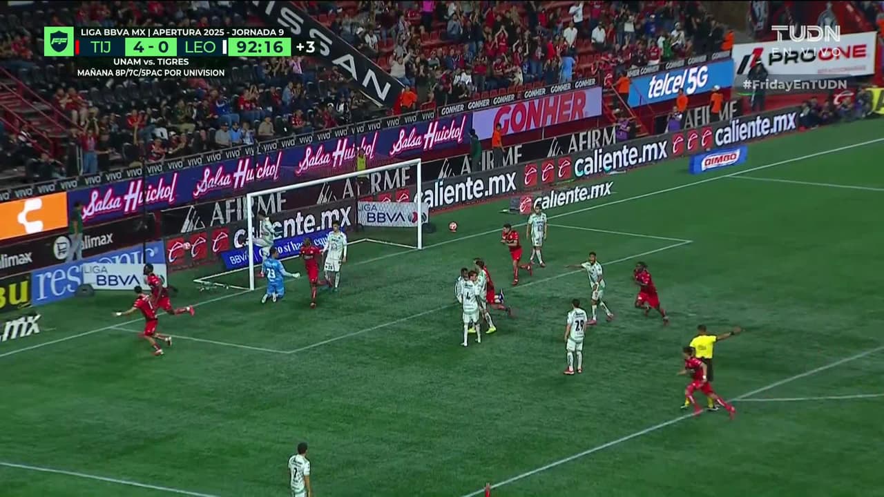 ¡Gol! Club Tijuana 5| León 0. Shamar Nicholson (Club Tijuana) Disparo con la derecha desde muy cerca tras el cobro de una falta.