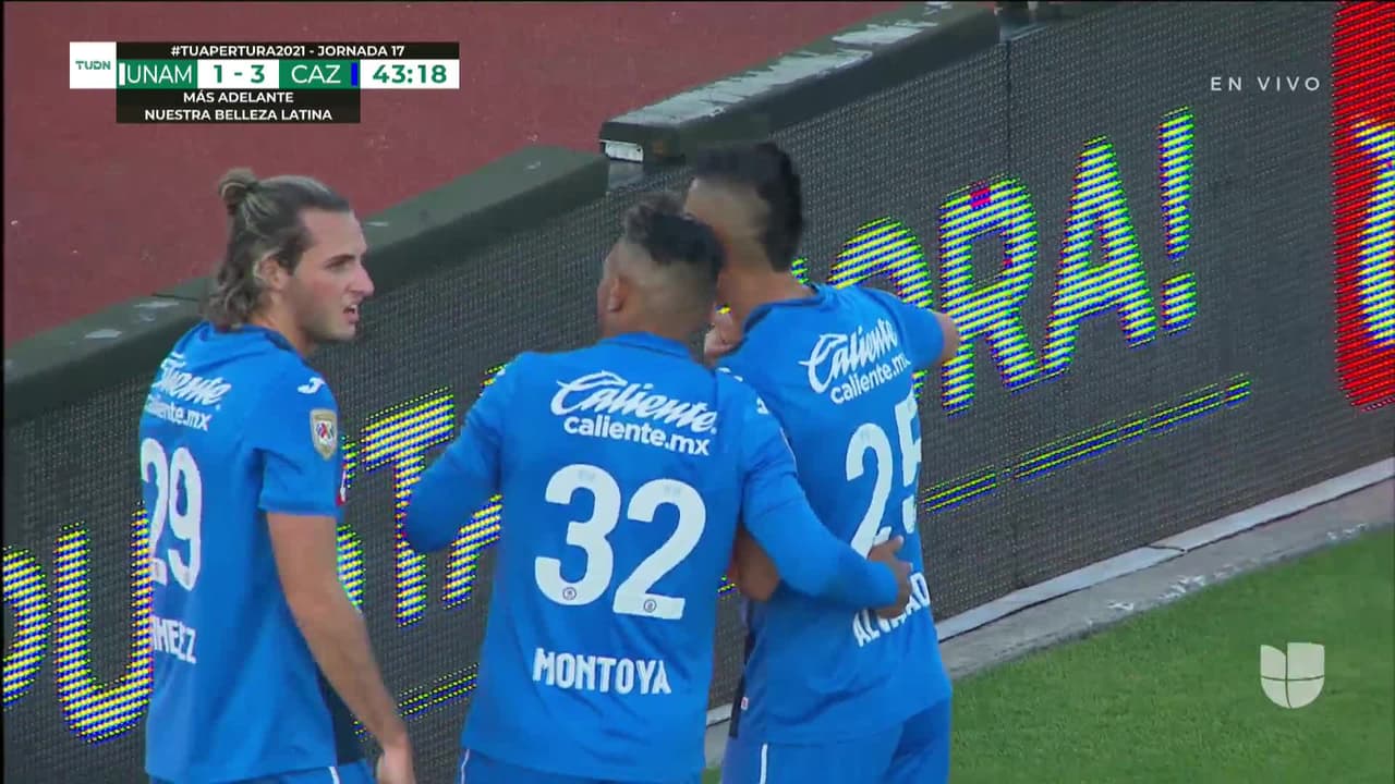 ¡Gol! Pumas UNAM 1| Cruz Azul 3. Roberto Alvarado (Cruz Azul) Disparo con la derecha desde muy cerca al centro de la portería. Asistencia de José Martínez.
