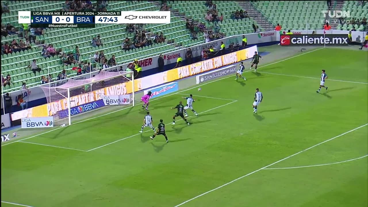 ¡Gol! Santos Laguna 0| FC Juárez 1. Óscar Estupiñán (FC Juárez) Disparo con la derecha desde muy cerca.