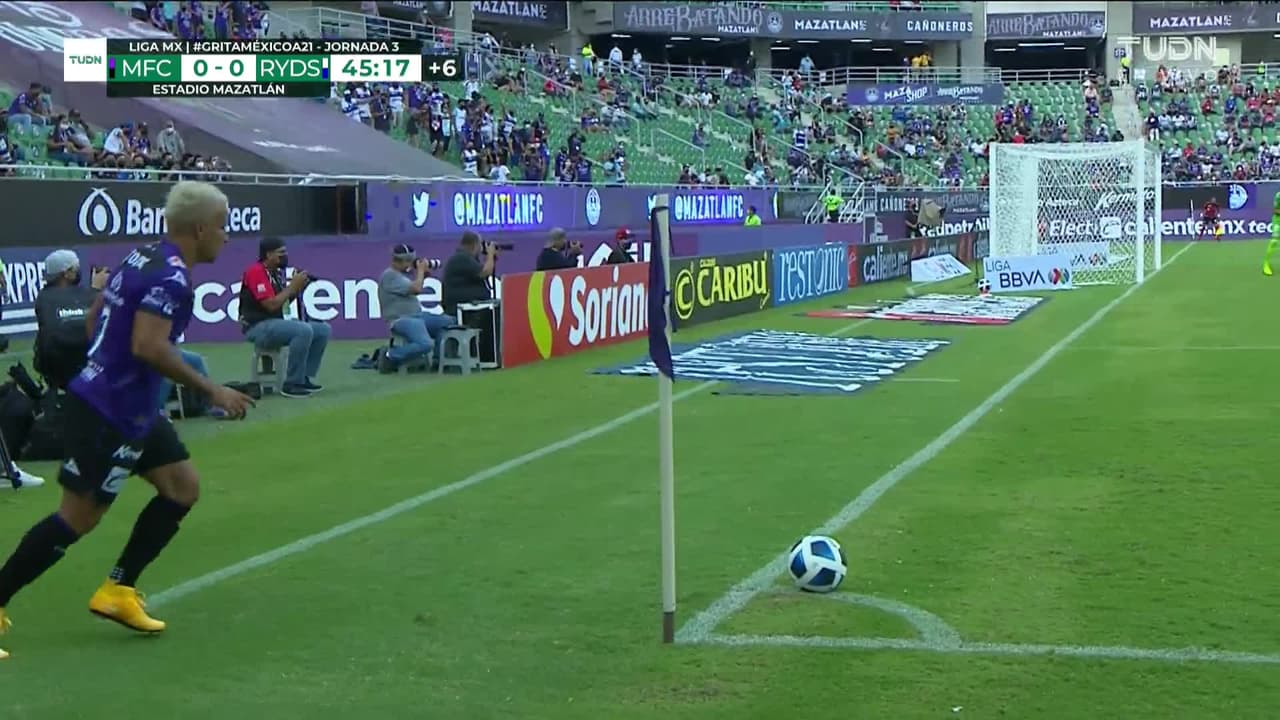 ¡Gol! Mazatlán FC 1| Monterrey 0. Néstor Vidrio (Mazatlán FC) disparo de cabeza a quemarropa desde el lado izquierdo tras un saque de esquina.