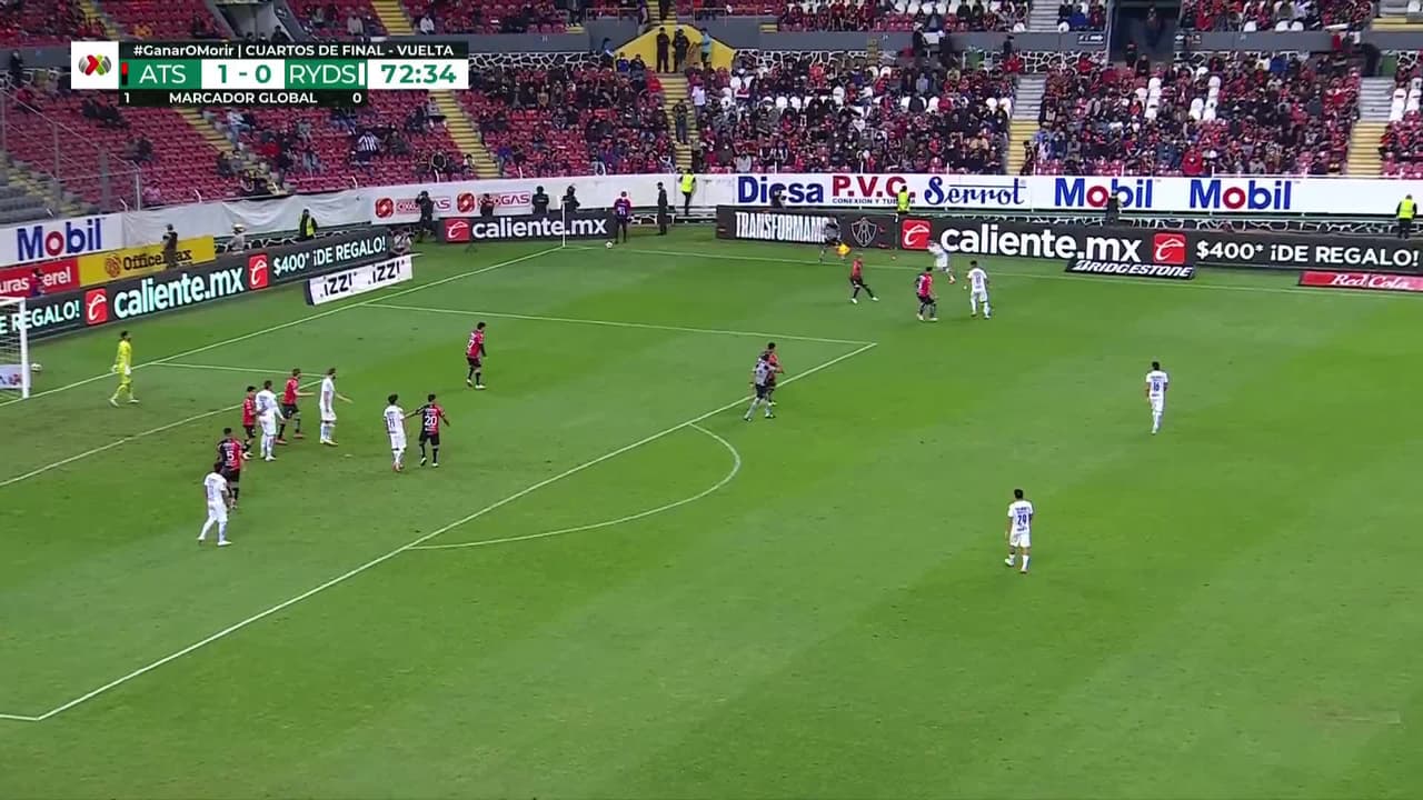 ¡Gol! Atlas 1| Monterrey 1. Arturo González (Monterrey) disparo de cabeza a quemarropa desde el lado derecho al centro de la portería. Asistencia de Maximiliano Meza con un centro al área.