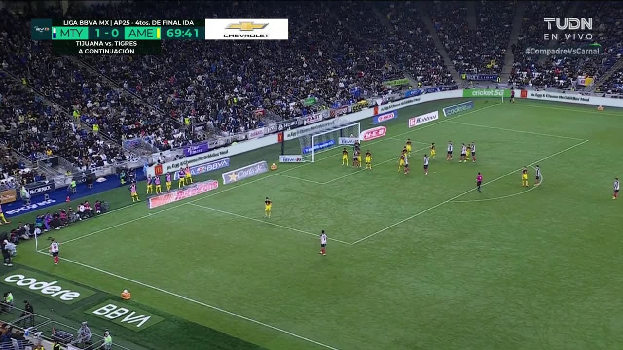 ¡Gol! Monterrey 2| América 0. Fidel Ambríz (Monterrey) disparo de cabeza desde el centro del área tras un saque de esquina.