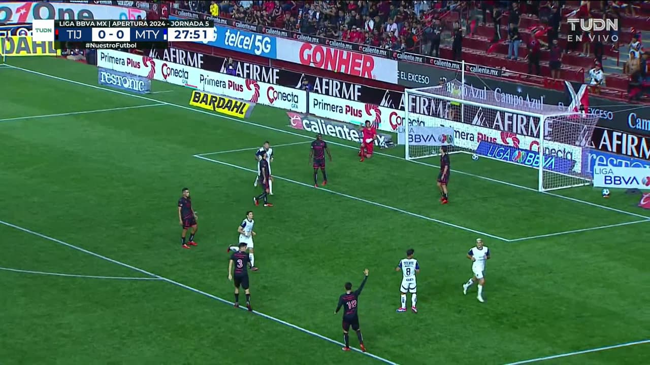 ¡Gol! Club Tijuana 0| Monterrey 1. Germán Berterame (Monterrey) disparo de cabeza desde el centro del área tras un saque de esquina.