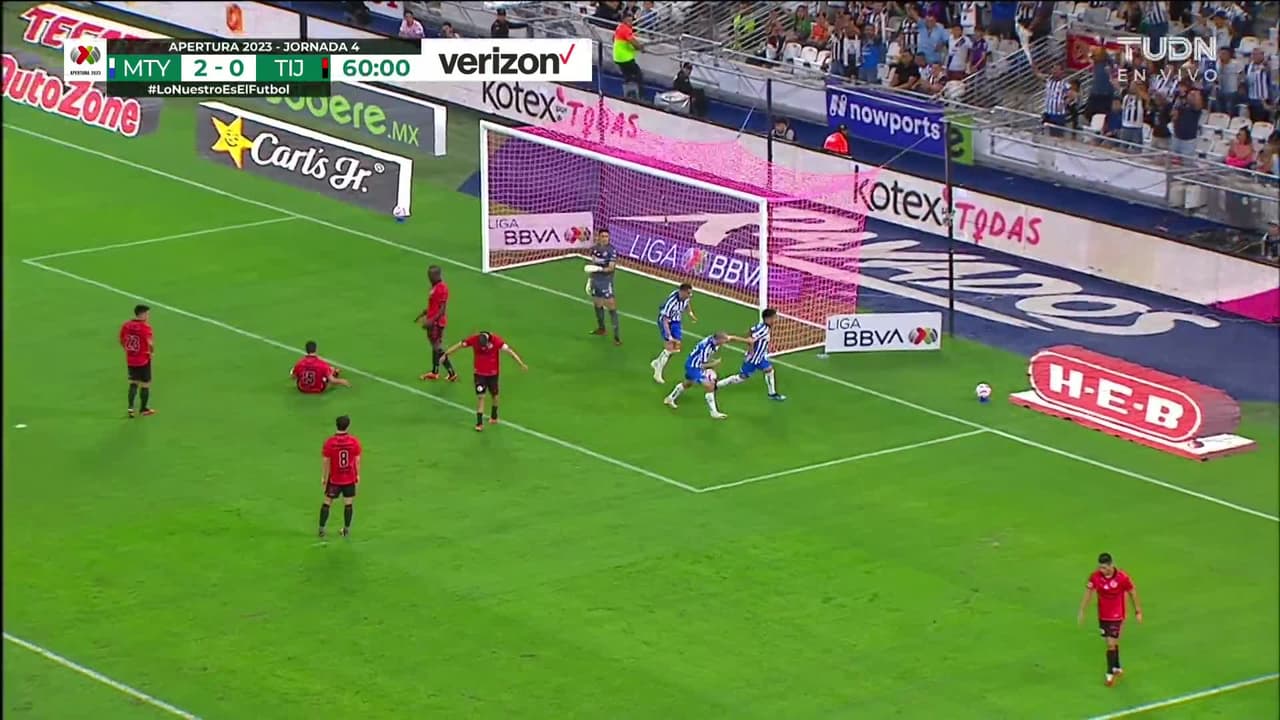 ¡Gol! Monterrey 3| Club Tijuana 0. Victor López (Monterrey) disparo de cabeza desde el centro del área.
