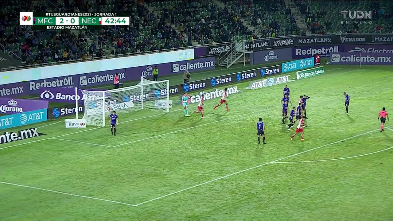 ¡Gol! Mazatlán FC 2| Necaxa 1. Juan Delgado (Necaxa) Disparo con la derecha desde el lado derecho dentro del área tras un saque de esquina.
