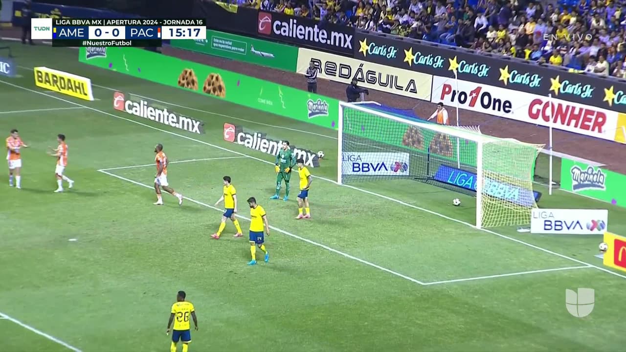 ¡Gol! América 0| Pachuca 1. Arturo González (Pachuca) disparo de cabeza desde el centro del área.