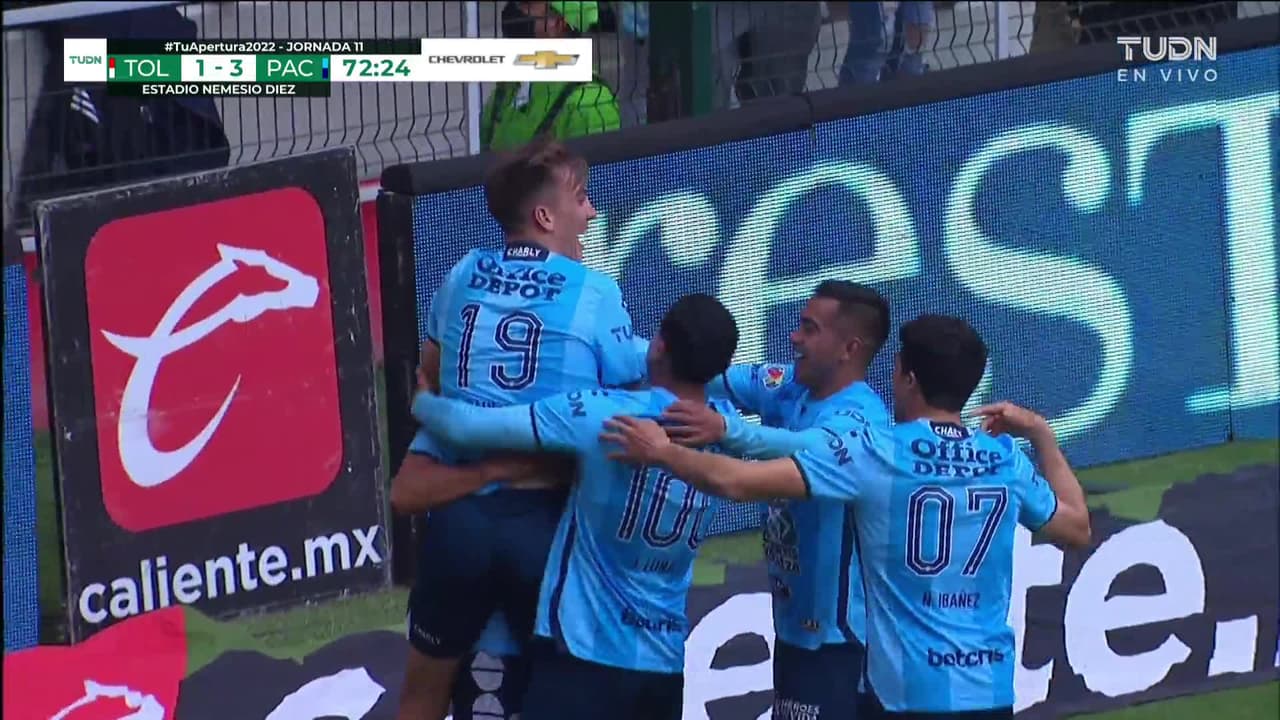 ¡Gol! Toluca 1| Pachuca 3. Paulino De La Fuente (Pachuca) Disparo con la derecha desde el centro del área.