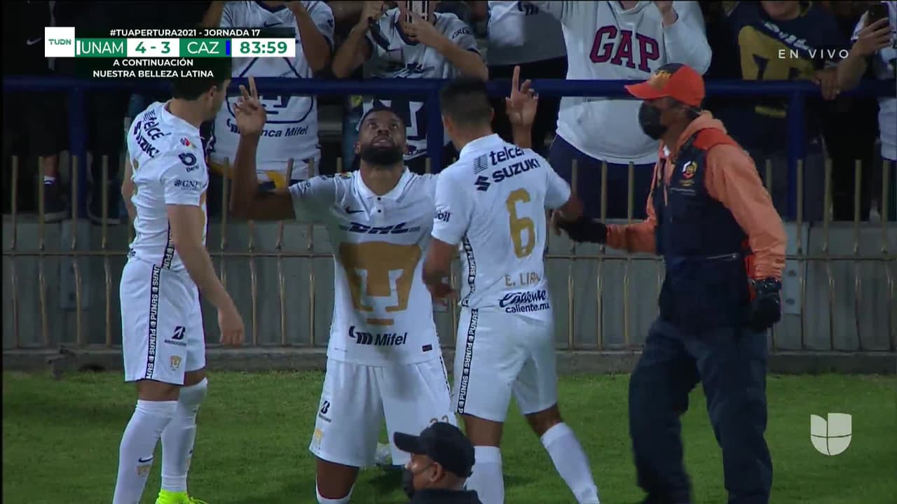 ¡Gol! Pumas UNAM 4| Cruz Azul 3. Diogo (Pumas UNAM) Disparo con la derecha desde el centro del área tras un contragolpe.