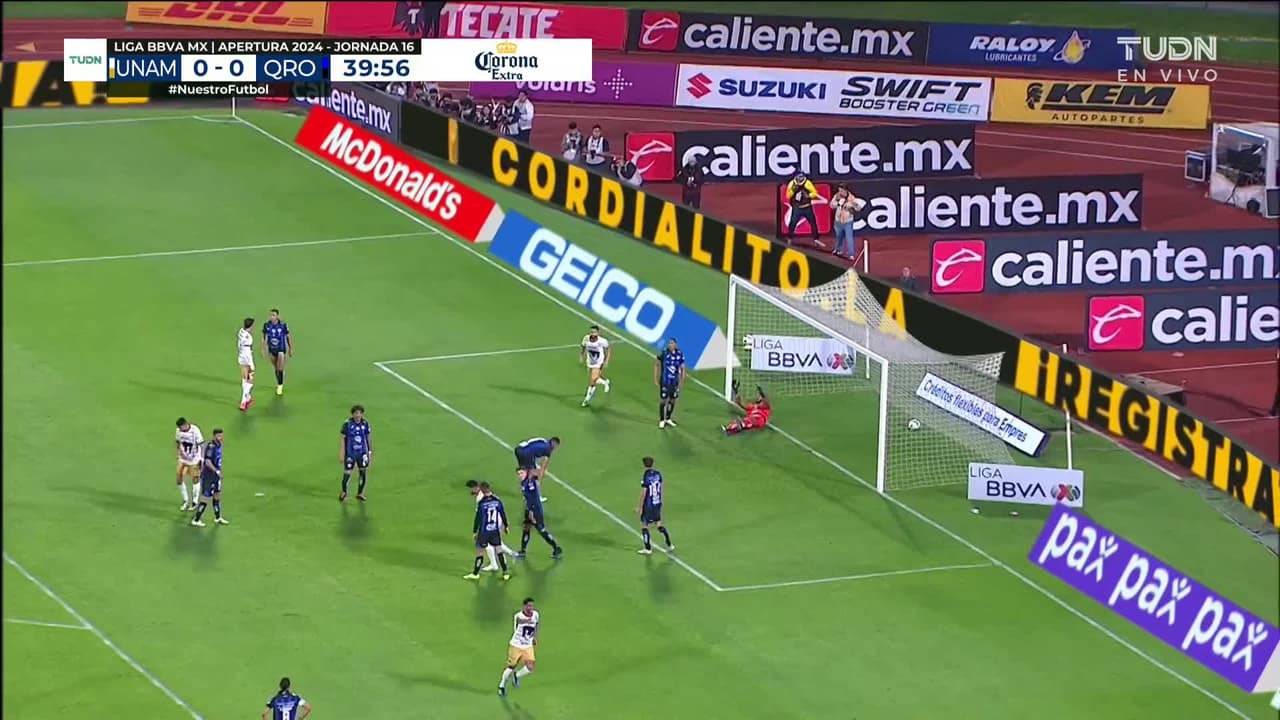 ¡Gol! Pumas UNAM 1| Querétaro 0. José Caicedo (Pumas UNAM) disparo de cabeza desde el centro del área tras un saque de esquina.