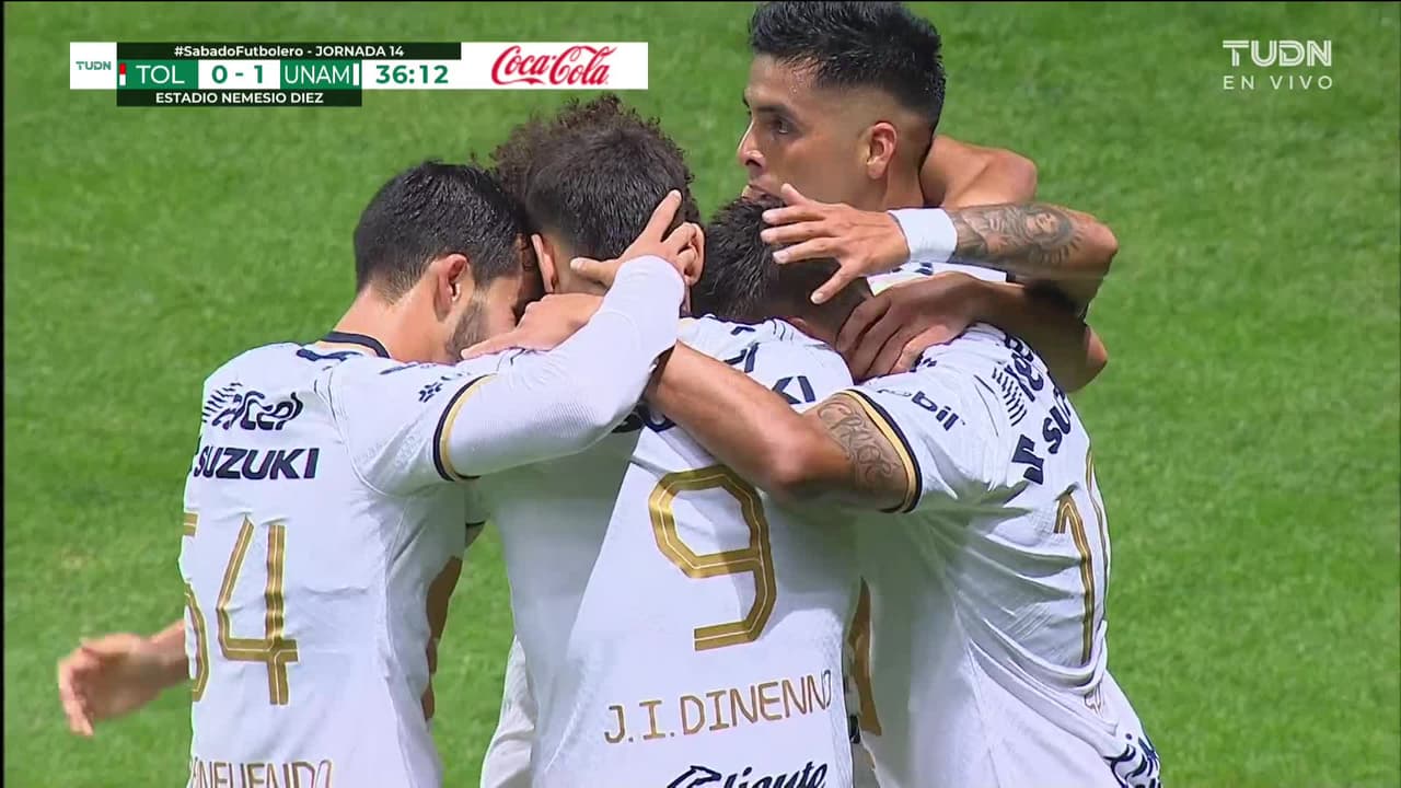 ¡Gol! Toluca 0| Pumas UNAM 1. Juan Dinenno (Pumas UNAM) Disparo con la derecha a quemarropa desde el lado derecho.