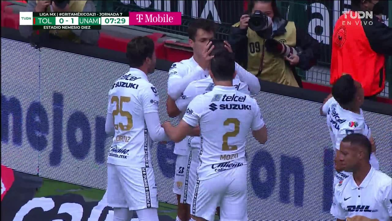 ¡Gooooool! Toluca 0| Pumas UNAM 1. Juan Ignacio Dinenno (Pumas UNAM) convirtió el penalti remate con la derecha.