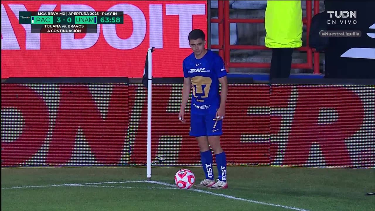 ¡Gol! Pachuca 3| Pumas UNAM 1. Pedro Vite (Pumas UNAM) Disparo con la derecha desde el centro del área tras un saque de esquina.