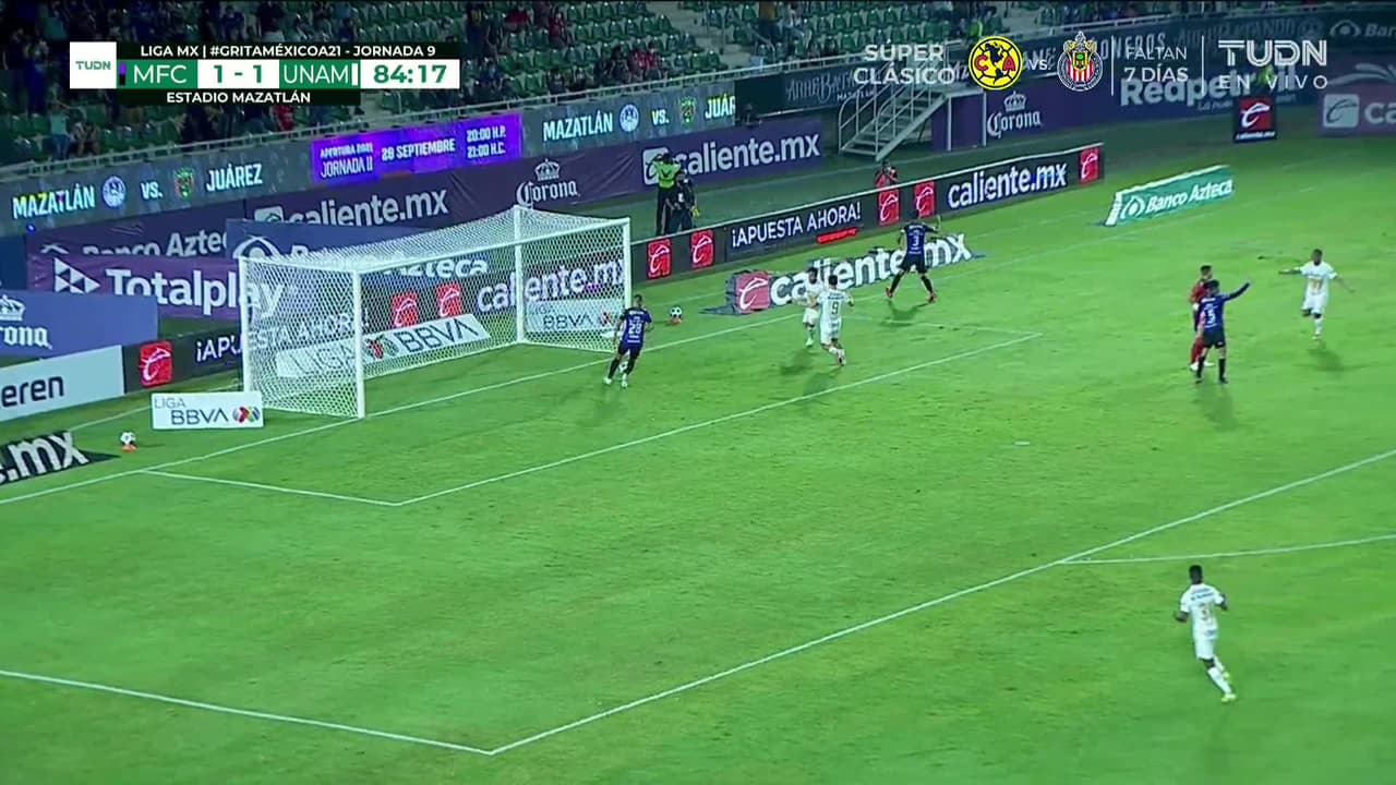 ¡Gooooool! Mazatlán FC 1| Pumas UNAM 2. Rogério (Pumas UNAM) remate con la derecha desde el lado derecho del interior del área.
