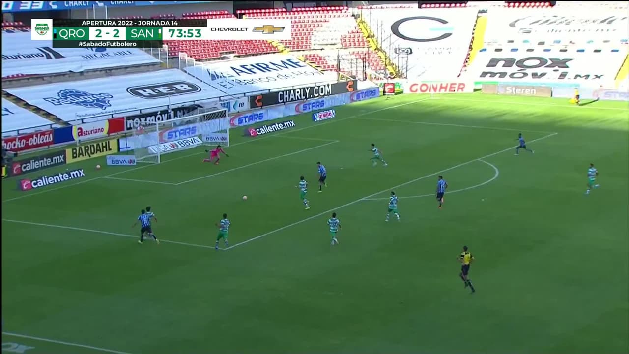 ¡Gol! Querétaro 3| Santos Laguna 2. Ettson Ayón (Querétaro) Disparo con la derecha desde el centro del área al centro de la portería.
