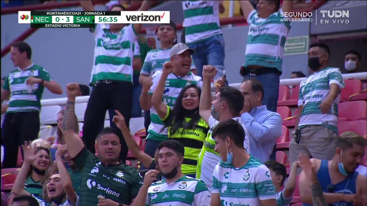 ¡Gol! Necaxa 0| Santos Laguna 3. Diego Valdés (Santos Laguna) Disparo con la derecha sin ángulo desde la derecha disparo rastrero| junto al palo izquierdo. Asistencia de Jesús Ocejo con un pase de cabeza.