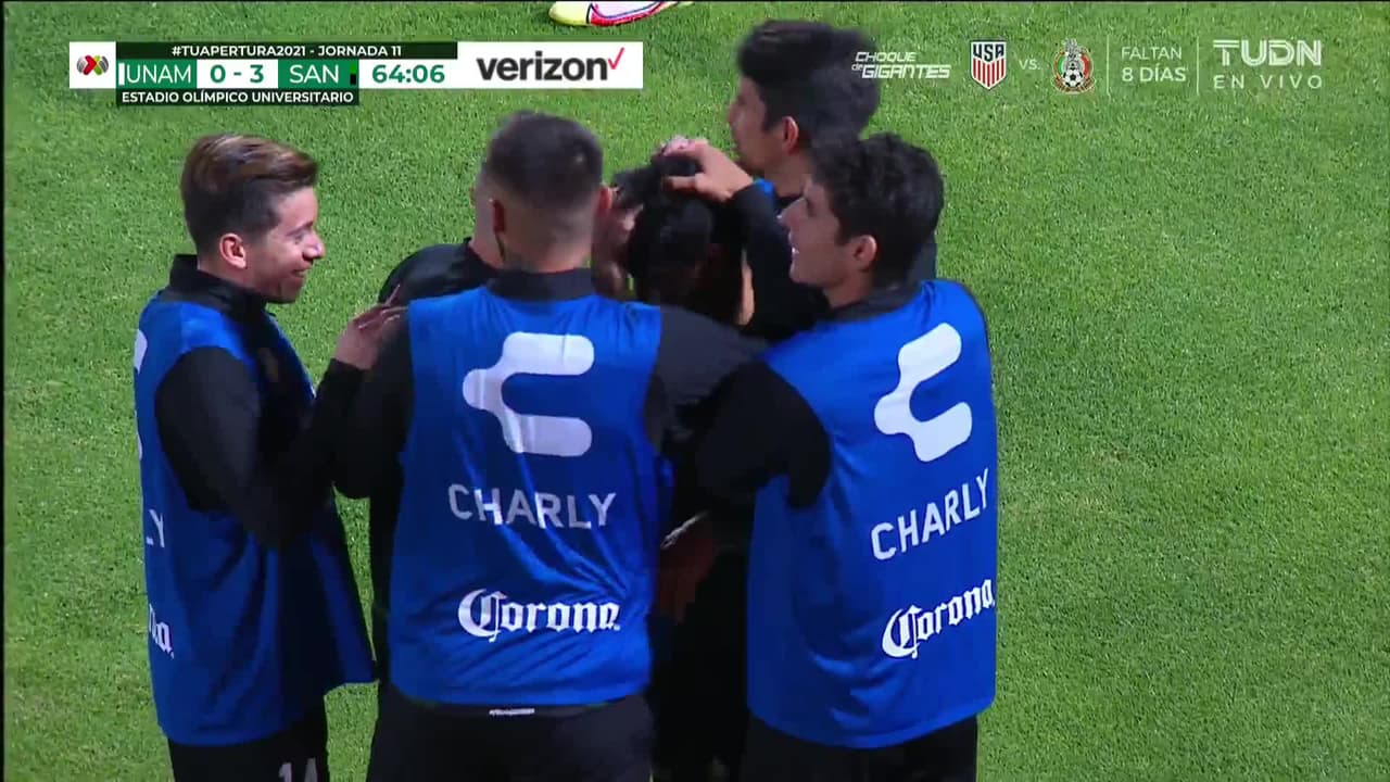¡Gol! Pumas UNAM 0| Santos Laguna 3. Omar Campos (Santos Laguna) zurdazo desde el lado izquierdo dentro del área tras un contragolpe.