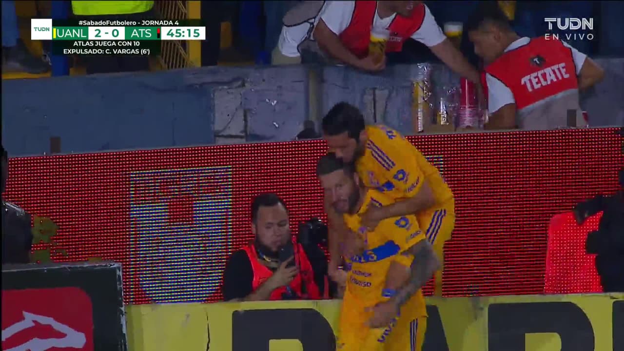 ¡Gol! Tigres 2| Atlas 0. André-Pierre Gignac (Tigres) Disparo con la derecha desde el centro del área.