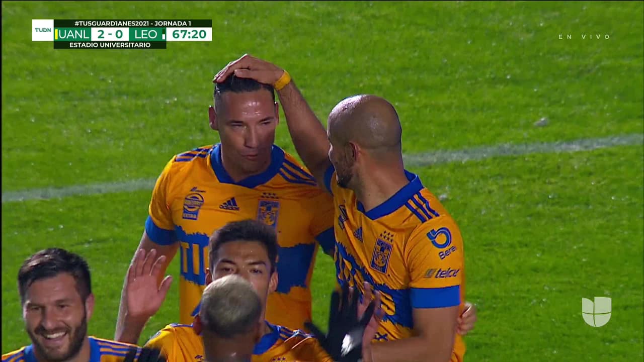 ¡Gol! Tigres 2| León 0. Carlos González (Tigres) zurdazo desde muy cerca disparo rastrero| junto al palo izquierdo tras un saque de esquina.