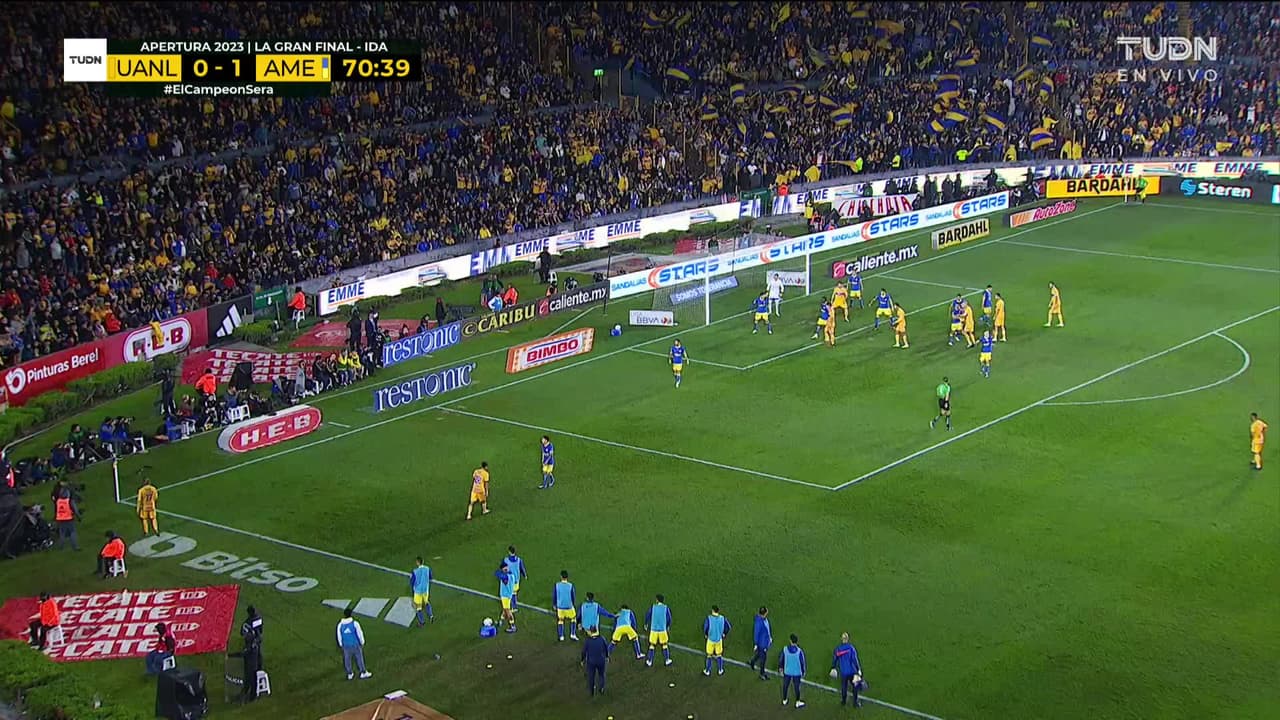 ¡Gol! Tigres 1| América 1. Ozziel Herrera (Tigres) disparo de cabeza desde el centro del área tras un saque de esquina.