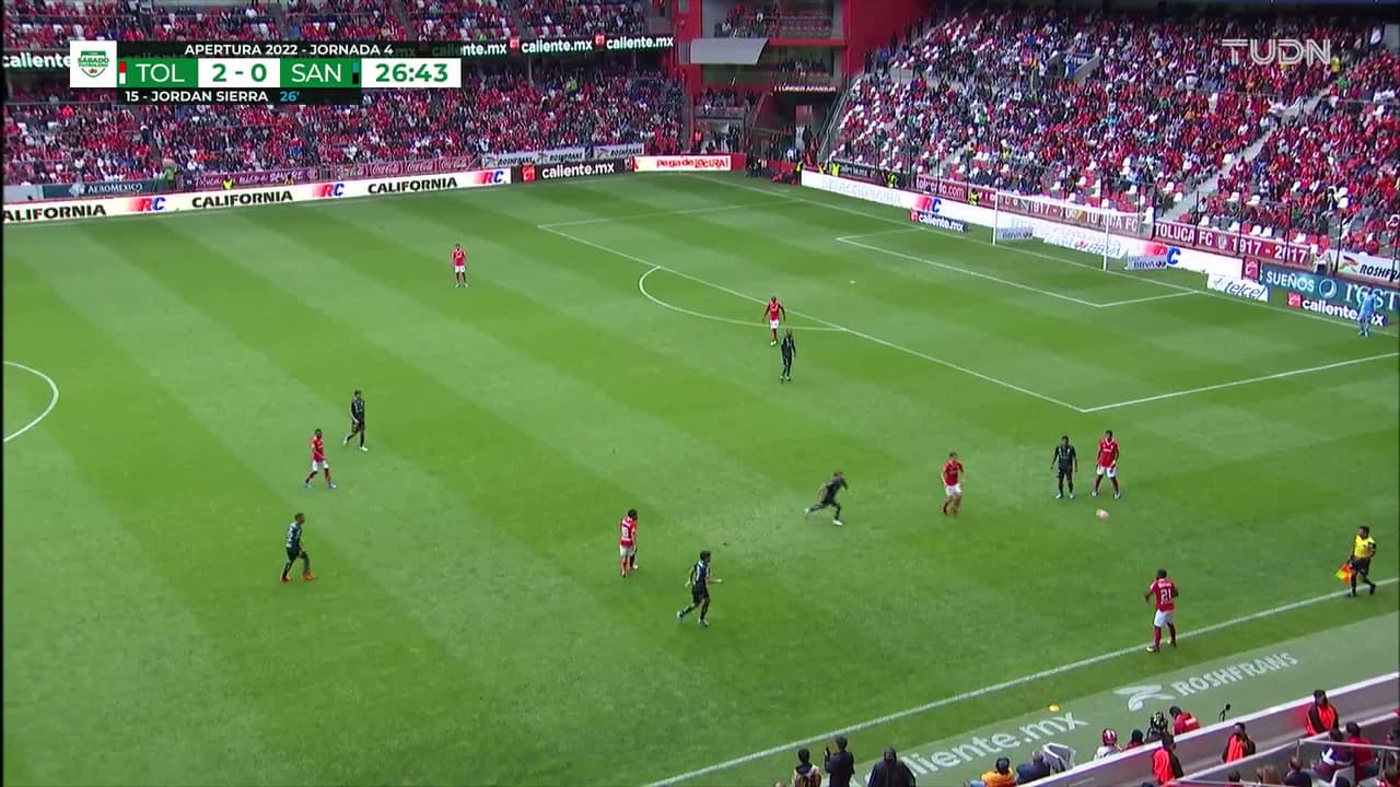 ¡Gol! Toluca 2| Santos Laguna 0. Jordan Sierra (Toluca) zurdazo desde el centro del área.