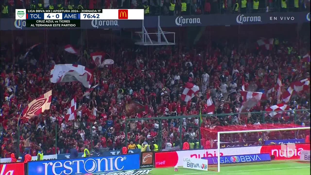 ¡Gol! Toluca 4| América 0. Luan (Toluca) Disparo con la derecha a quemarropa desde el lado derecho tras un saque de esquina.
