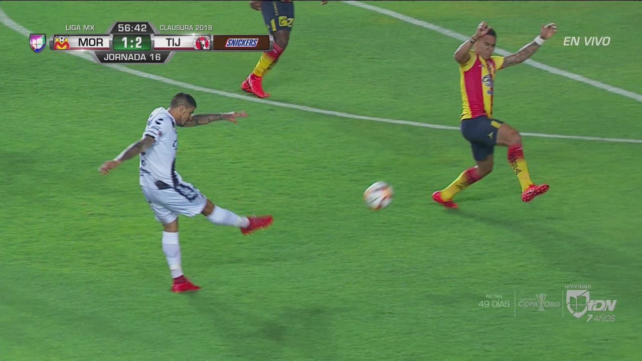 Imposible de atajar, Gustavo aprovecha el pase de Jesús Angulo, regatea ante la marca purépecha y dispara con potencia para la voltereta.