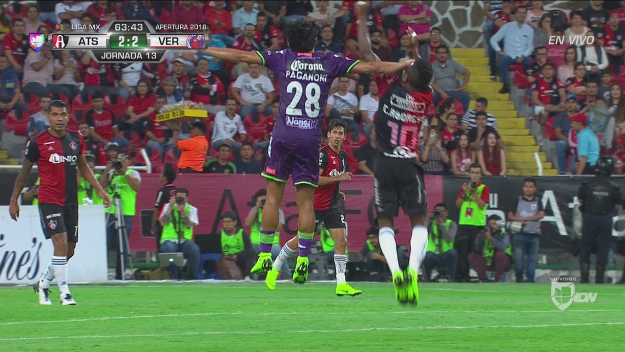 El defensor del Veracruz 'regaló' la primera amarilla al reclamar pidiendo el VAR, lo que está penado por el reglamento con amonestación.