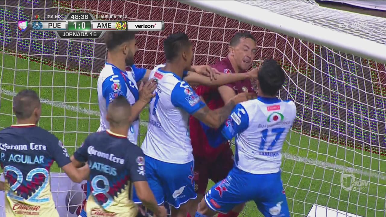 Tras una jugada en el área de las Águilas, jugadores de ambos clubes se enfrentaron directamente, pero el colegiado no vio nada.