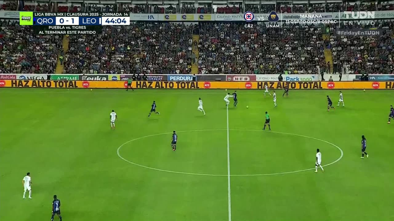 ¡Gol! Querétaro 1| León 1. Aldahir Pérez (Querétaro) zurdazo desde el centro del área.